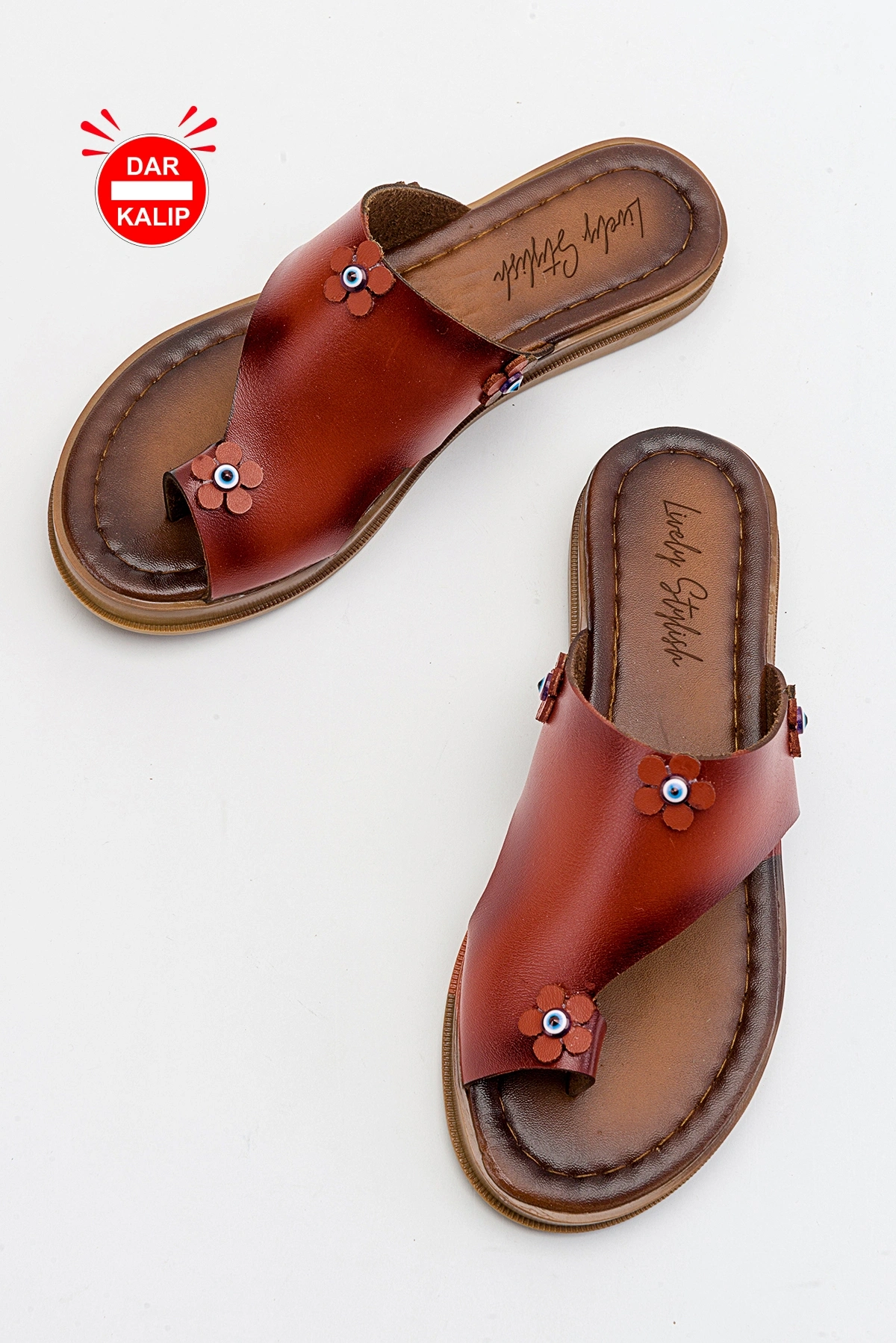 Angela Parmak Arası Çiçek Figürlü Deri Terlik
