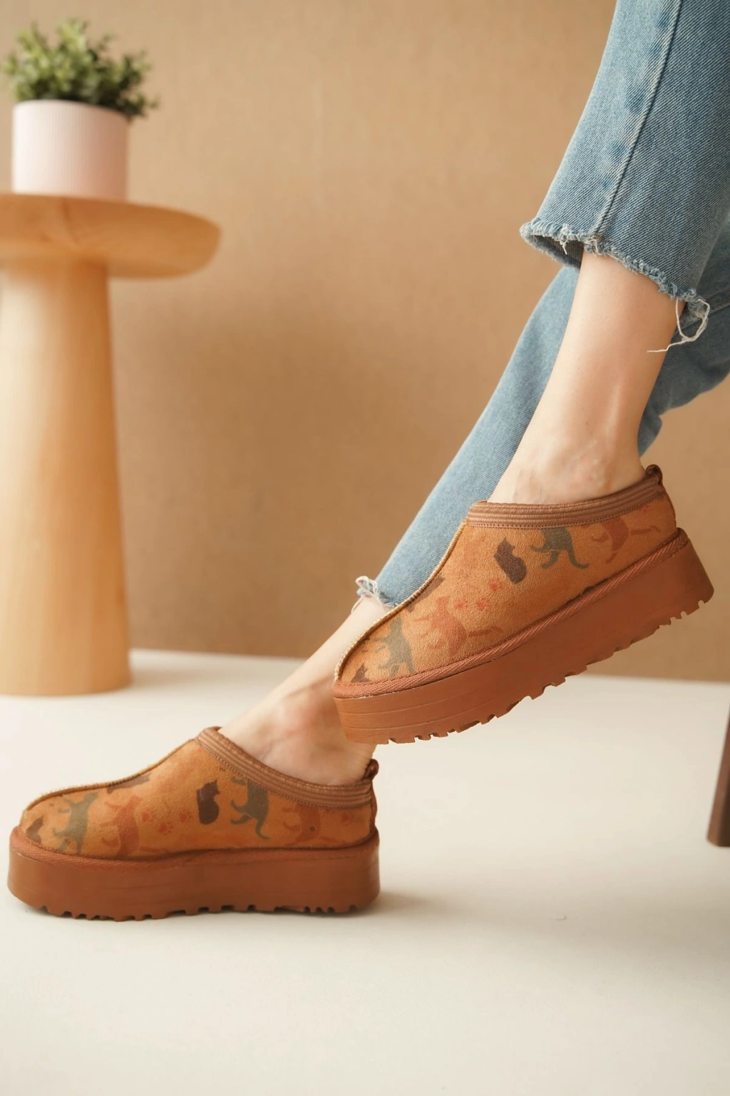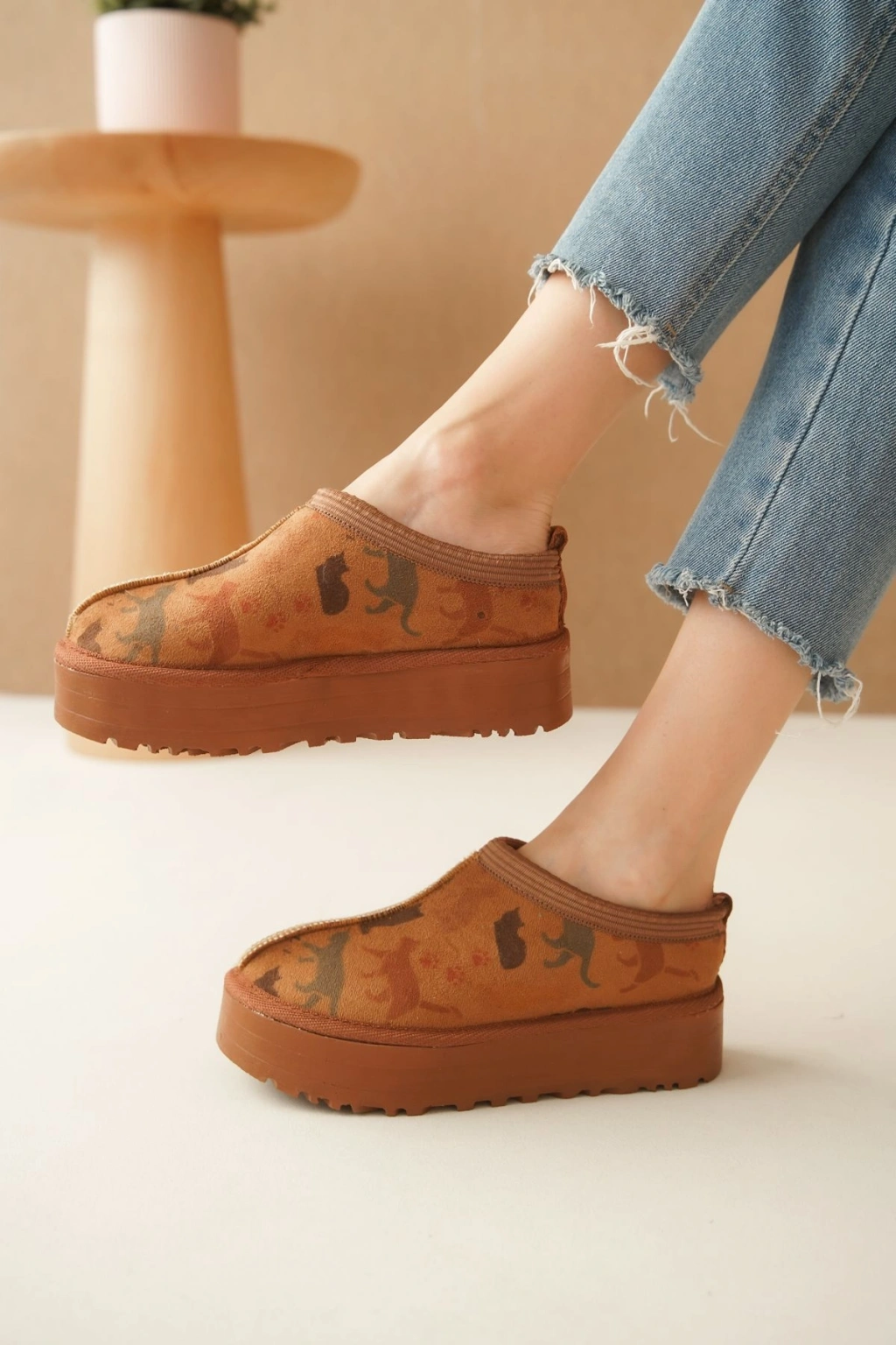 Ev Terliği Botu İçi Tüylü Su Geçirmez Rahat Kalın Taban Kedi Desenli