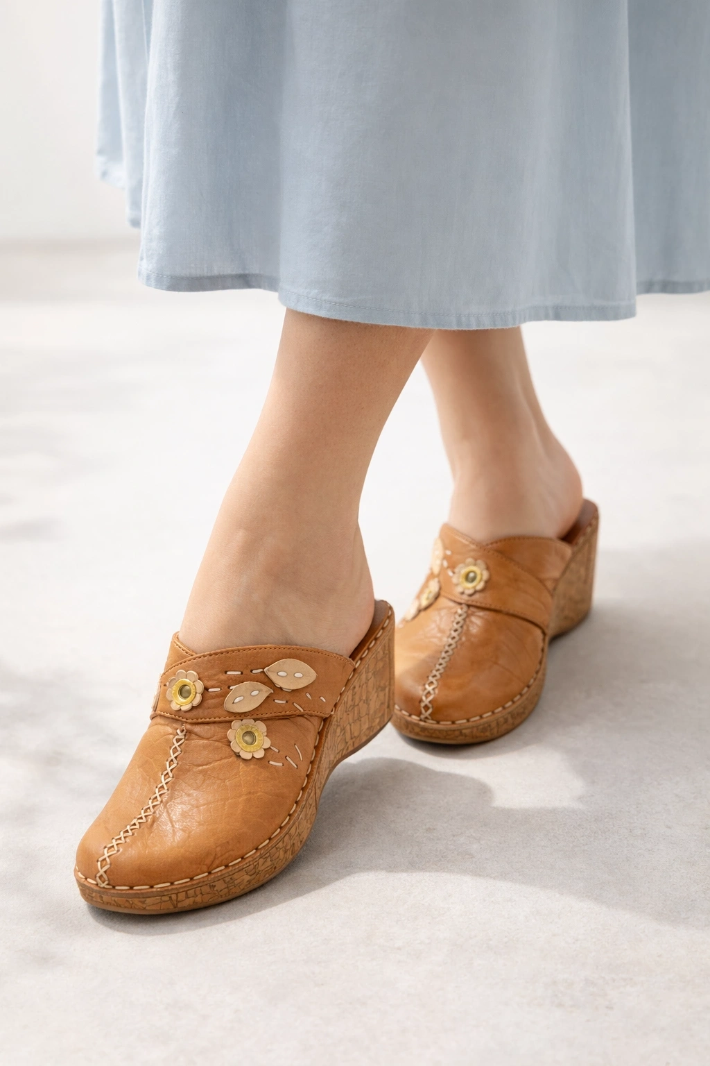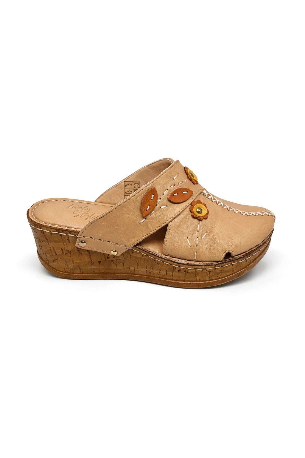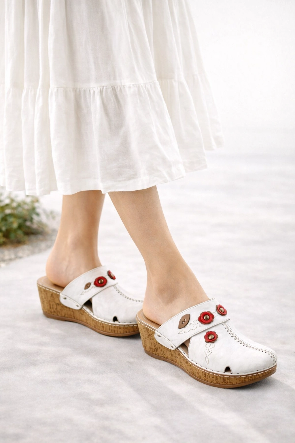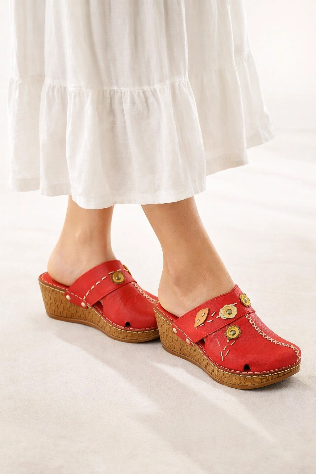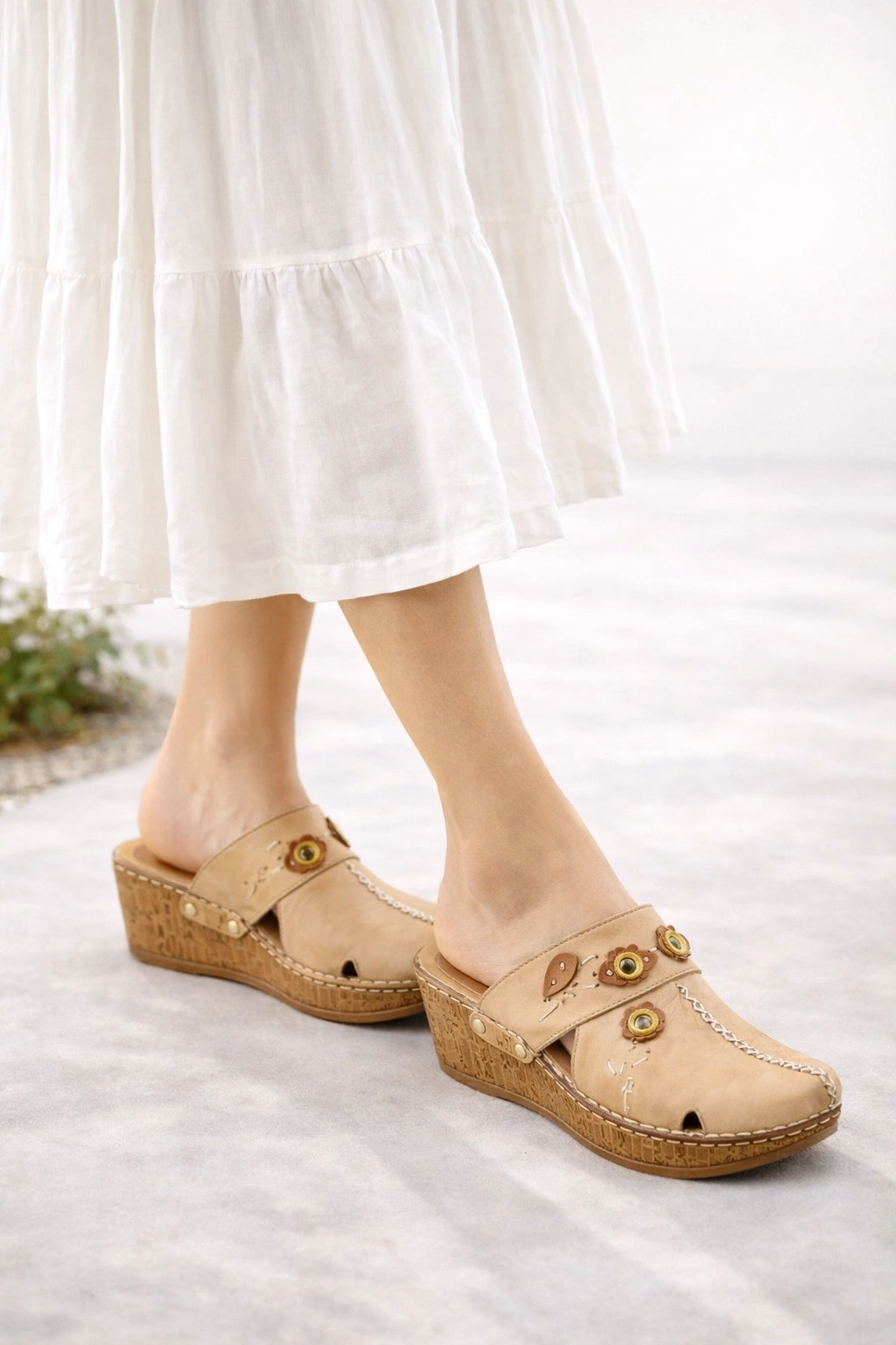 - Taban: Mantar (cork) wedge taban – hafif, yastıklama etkisi yüksek ve ortopedik destekli