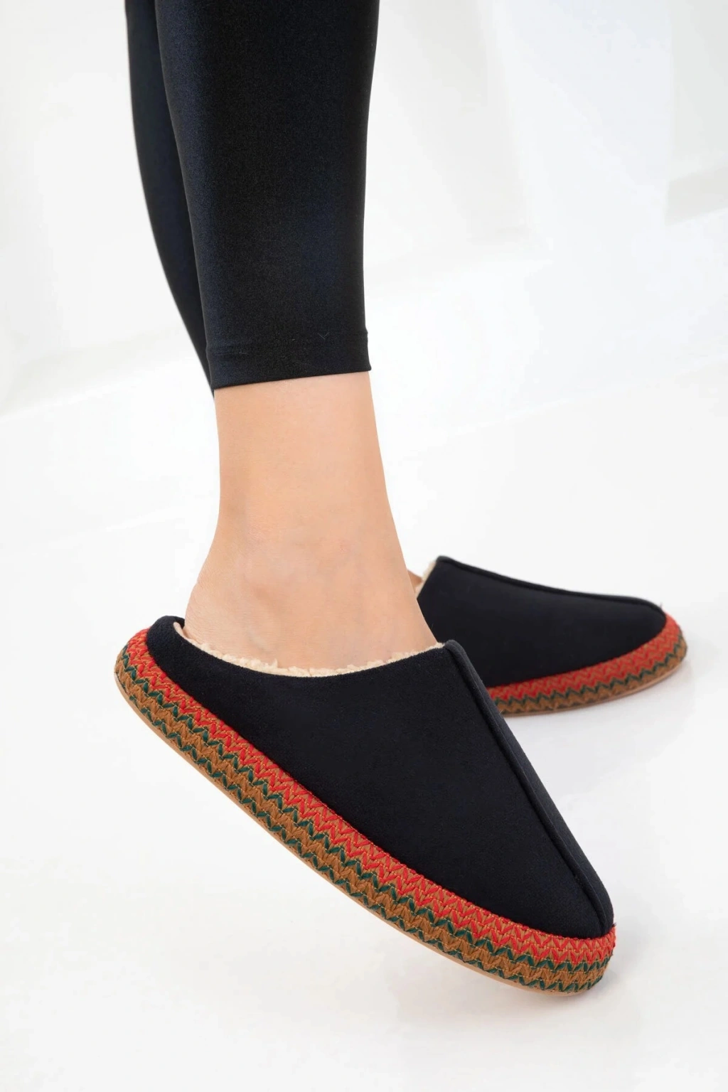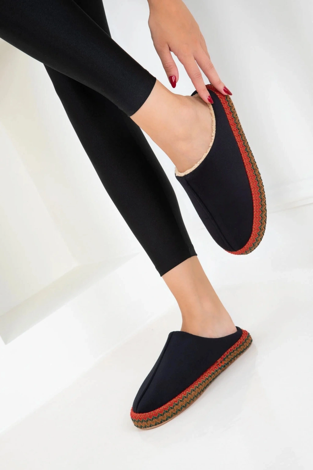 Kadın İçi Kürklü Hasır Şerit Detaylı Rahat Sessiz Ev Terliği