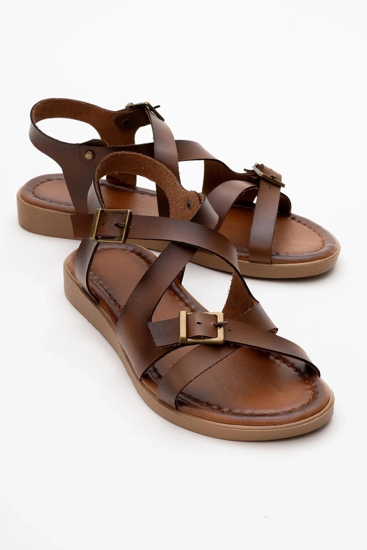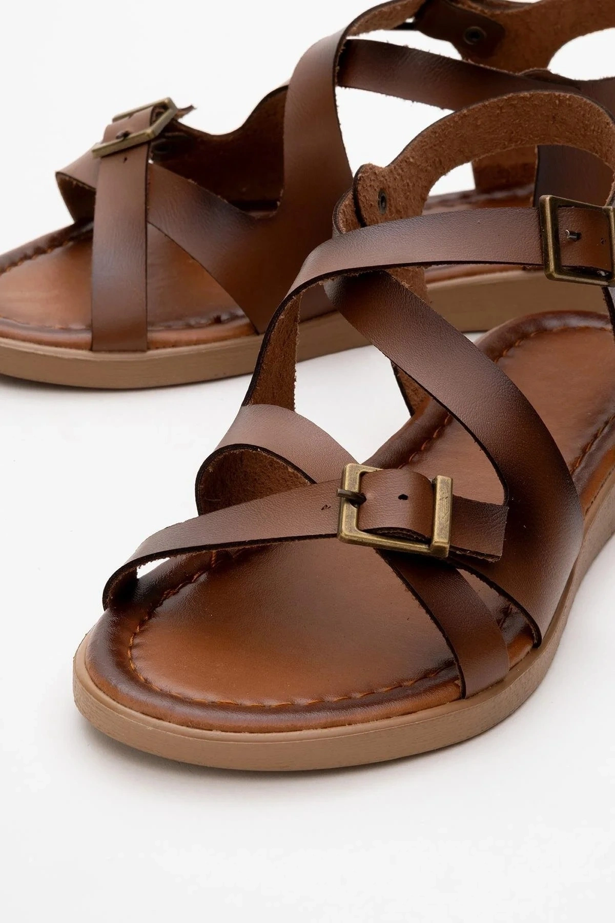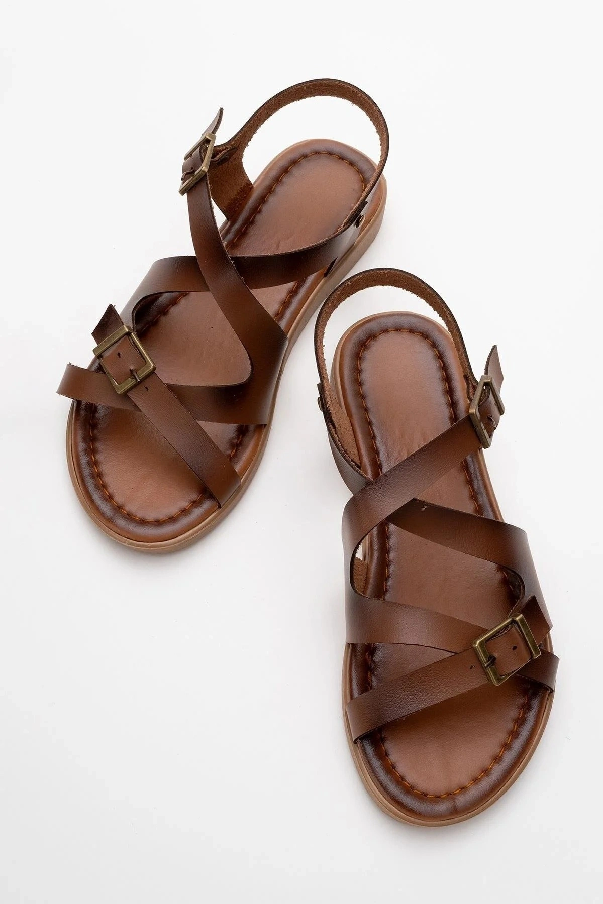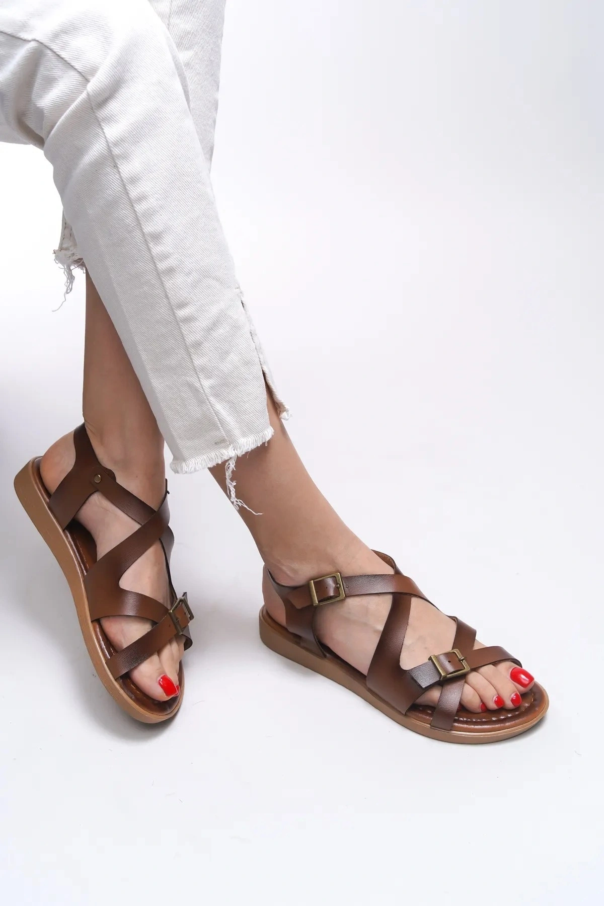 Lira Hakiki Deri Çift Tokalı Ayarlanabilir Çapraz Rahat Sandalet