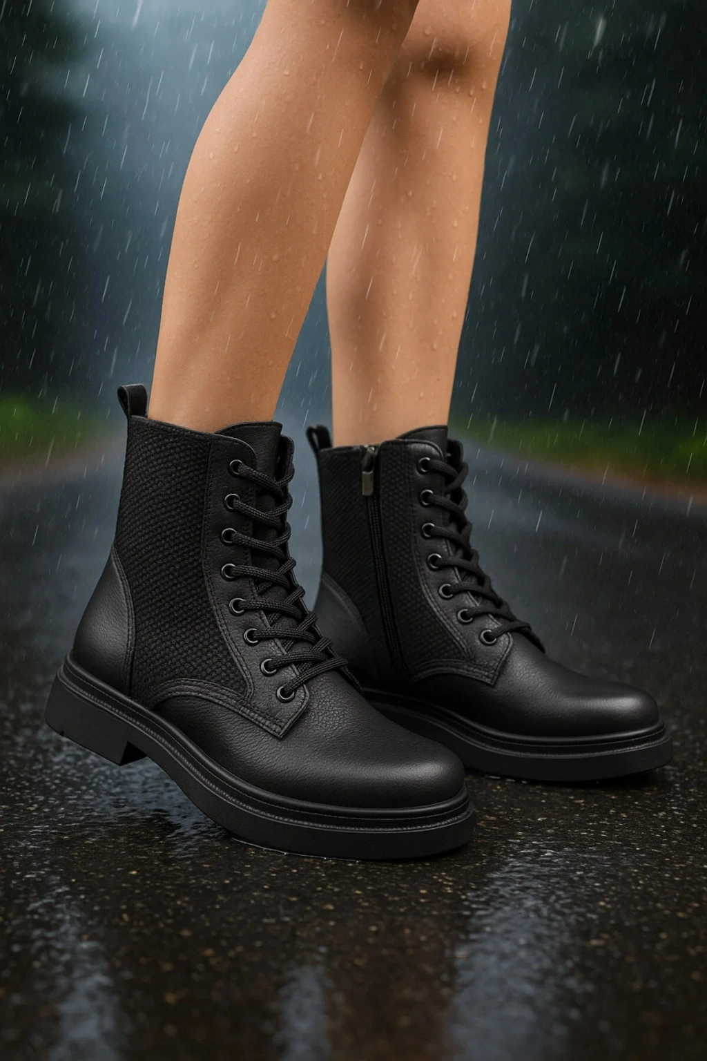 • Şık ve Fonksiyonel Detaylar:Bağcık detayı botunuza klasik bir hava katarken, yan fermuarı sayesinde kolayca giyip çıkarabilirsiniz. Topuk kısmındaki özel dokulu panel, ürüne modern bir dokunuş ekler.