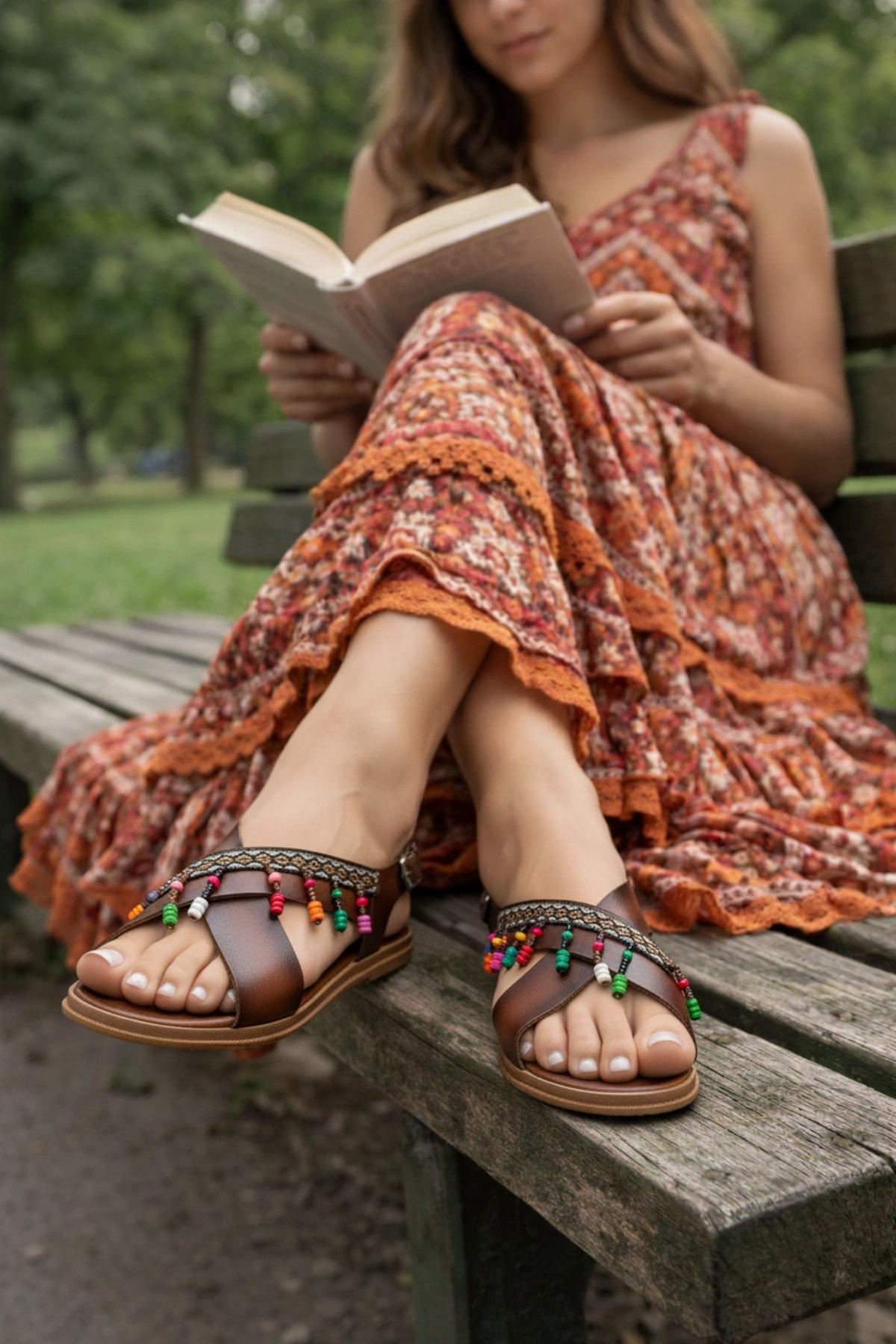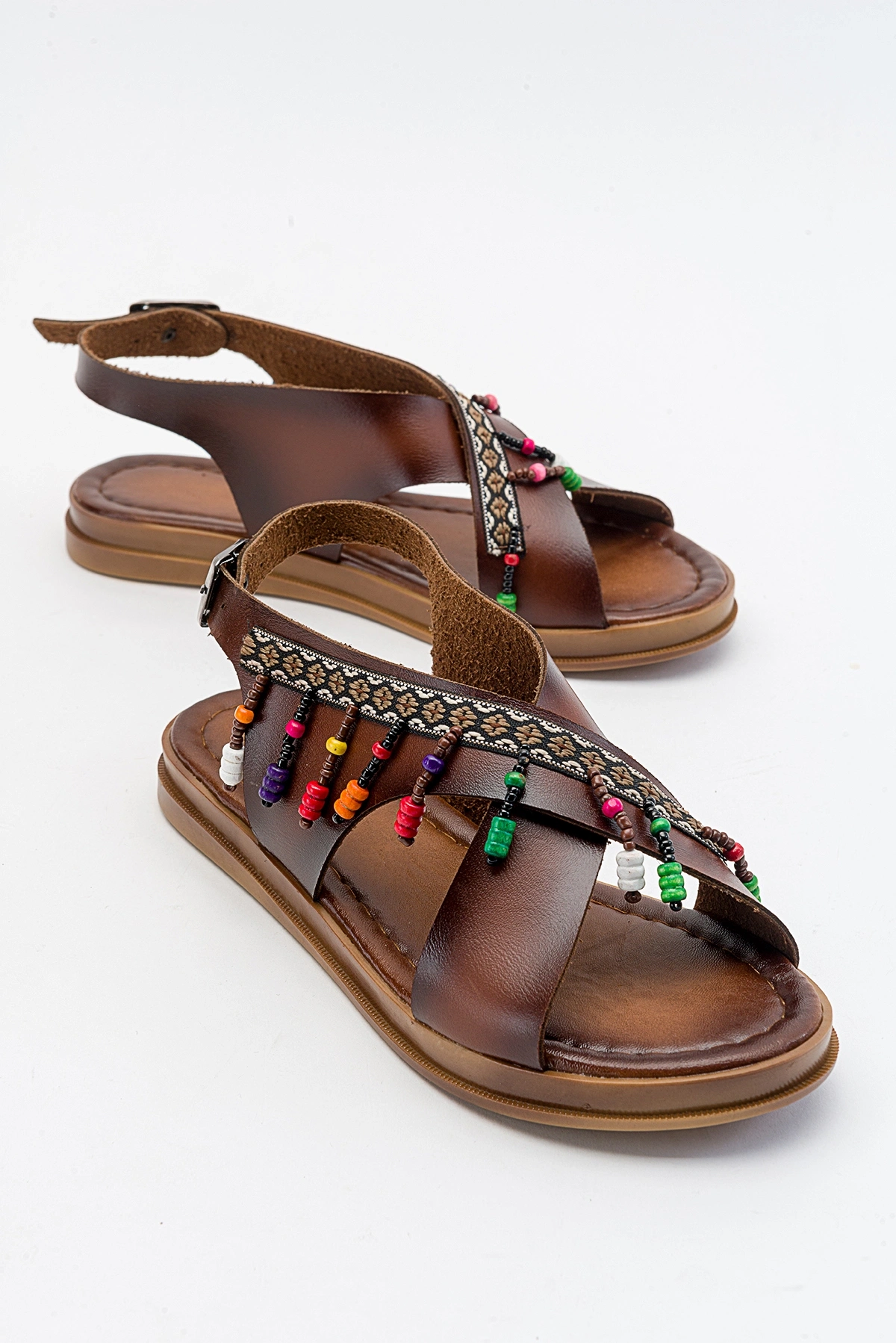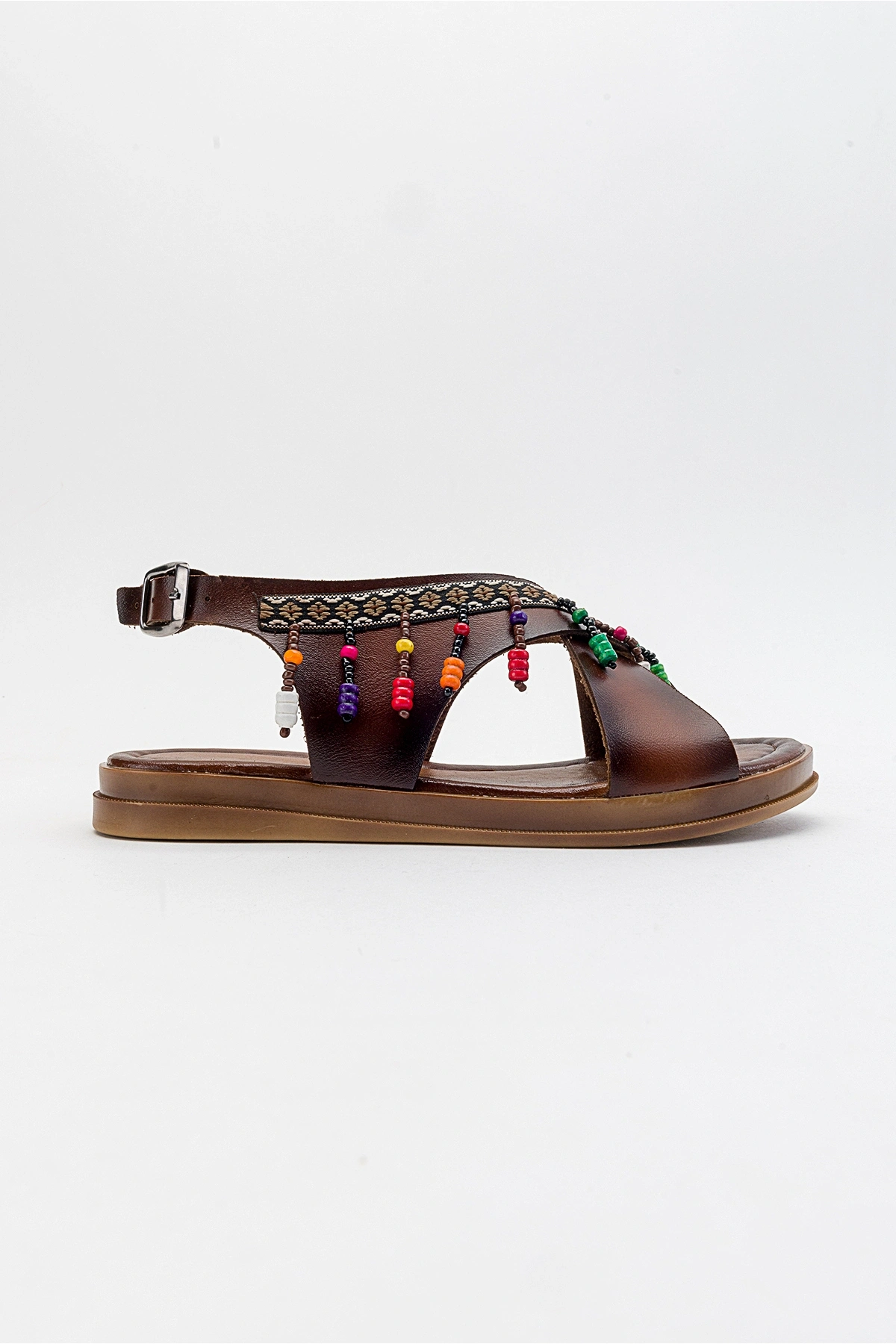 Rahatlıkla gün boyu kullanım için ideal, kısa topuklu (2 cm) tasarımıyla konforlu bir yürüyüş deneyimi sunar; Hakiki deri astar materyali sayesinde ayaklarınızın nefes almasını sağlar ve uzun süreli kullanımlarda bile rahatlık sunar; Saya kısmında kullanılan hakiki deri malzeme, dayanıklılığı artırırken şık bir görünüm kazandırır; İç tabanda da hakiki deri tercih edilerek ayak sağlığınız düşünülerek tasarlanmıştır; bu sayede maksimum konfor ve destek sağlanır; Pratik bantlı bağlama şekli ile kolayca giyilip çıkartılabilir ve ayakkabının ayağınıza tam oturmasını sağlar; Sade ve düz deseniyle her türlü kıyafetle kolayca uyum sağlayarak günlük kullanım için idealdir; Lisanslı koleksiyon parçası olarak öne çıkan bu sandalet, kalite ve stilin mükemmel birleşimini temsil eder; Düz topuklu yapısıyla gün içindeki hareket özgürlüğünüzü kısıtlamaz ve dengeli bir yürüyüş deneyimi sunar; Hakiki deri materyali sayesinde uzun;