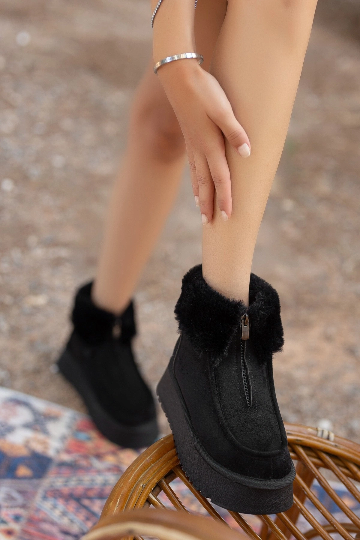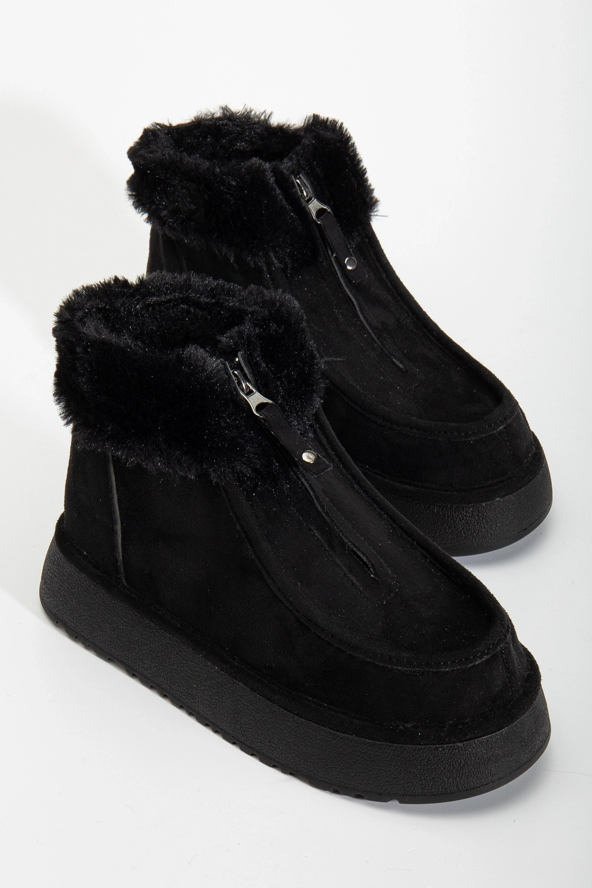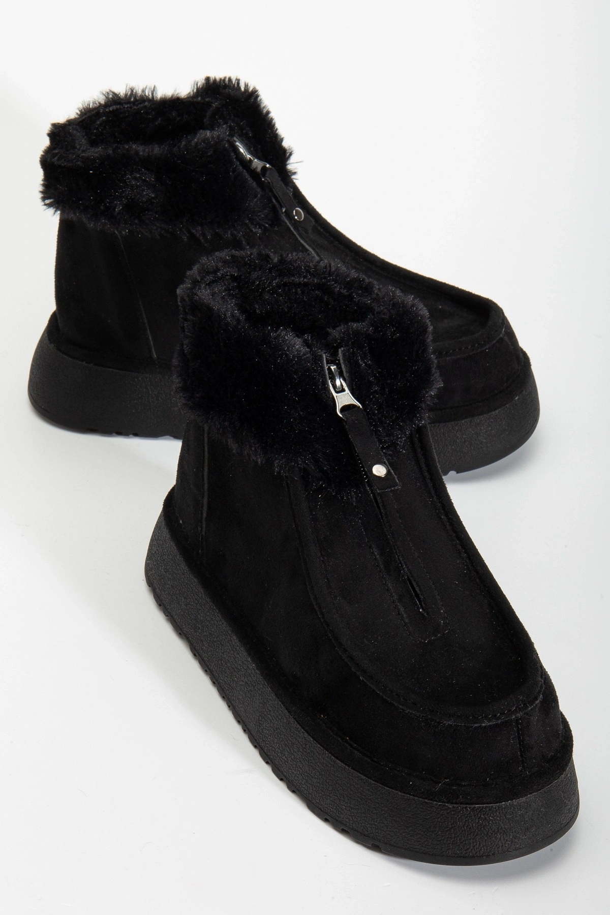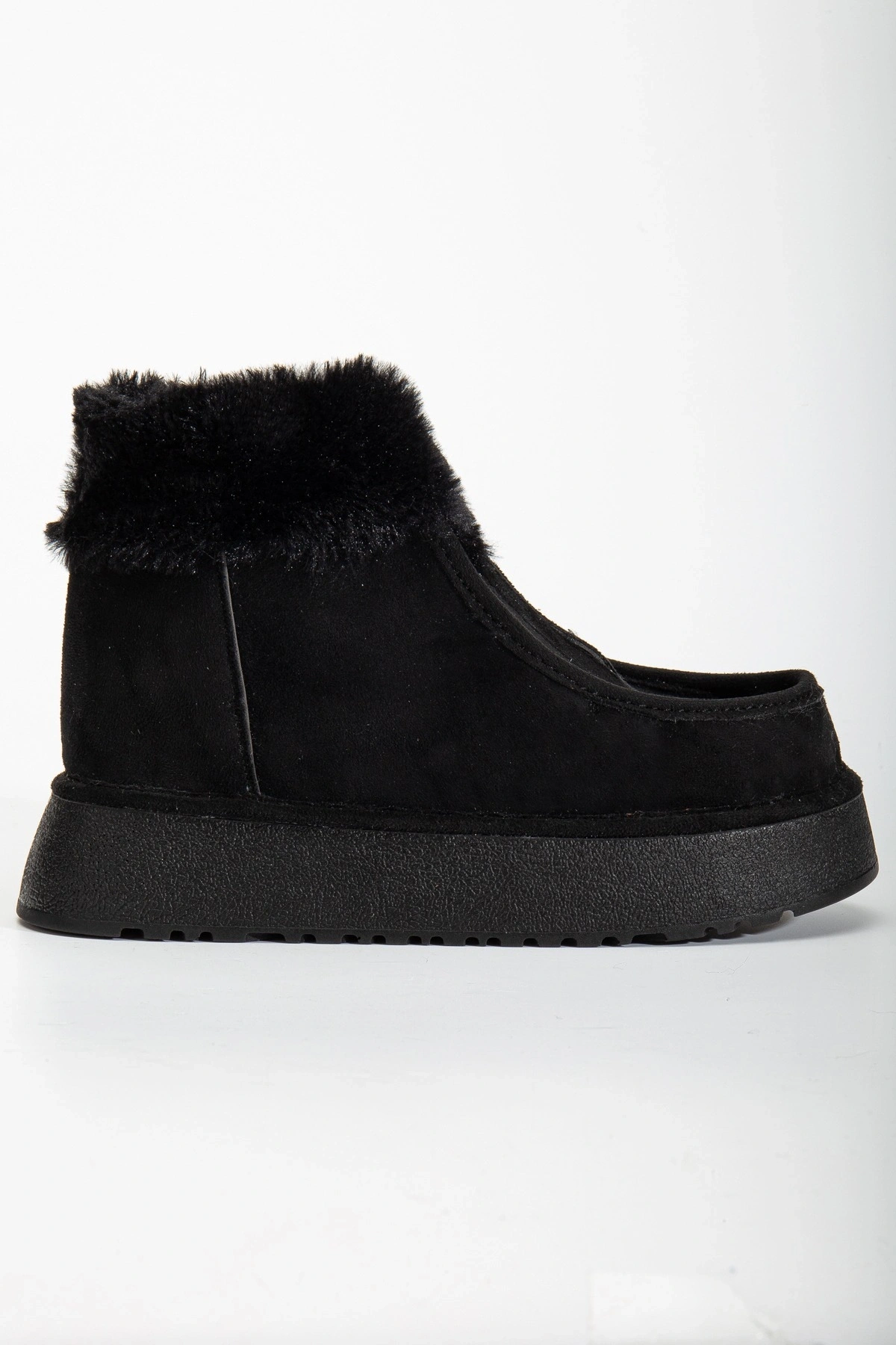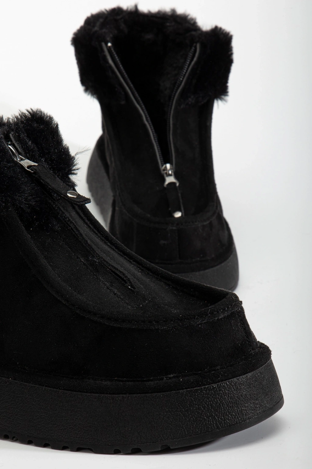 - Yumuşak ve sıcak tutan kürk astarlı iç yapısı ile soğuk kış günlerinde ayaklarınızı korur.; - Kaliteli suni süet deri dış materyali sayesinde dayanıklılık ve şık bir görünüm sunar.; - EVA taban materyali, hafifliği ve konforu bir arada sunarak uzun süreli kullanımlarda bile rahatlık sağlar.; - Fermuarlı bağlama şekli ile kolay giyilip çıkartılabilir; pratik kullanım imkanı sunar.; - Casual/Günlük ortamlarda rahatlıkla tercih edilebilecek tasarım, stilinizi tamamlar.; - Tekstil saya materyali ve astarı, nefes alabilirliği artırarak ayak sağlığınızı destekler.; - Yuvarlak burun tipi ile modern ve zamansız bir görünüm kazandırır.; - Bootie kalıbı, botların klasik ve şık duruşunu ön plana çıkarır.; - Günlük kullanım için idealdir; hem konforlu hem de şık adımlar atmanız için tasarlanmıştır.; - Kalın topuklu tasarım, dengeli bir yürüyüş deneyimi sunarken boyunuzu da hafifçe yükseltir.; - Türkiye'de üretilmiş olup, yerli malı olarak gurur verici bir tercih seçeneği sunar.; - Kısa topuk boyu (4 cm) ile hem rahatlık hem de zarif bir duruş sağlar.; - Yetişkin kadınlar için ideal yaş grubuna hitap ederken düz deseniyle kolayca kombinlenebilirlik sunar.;