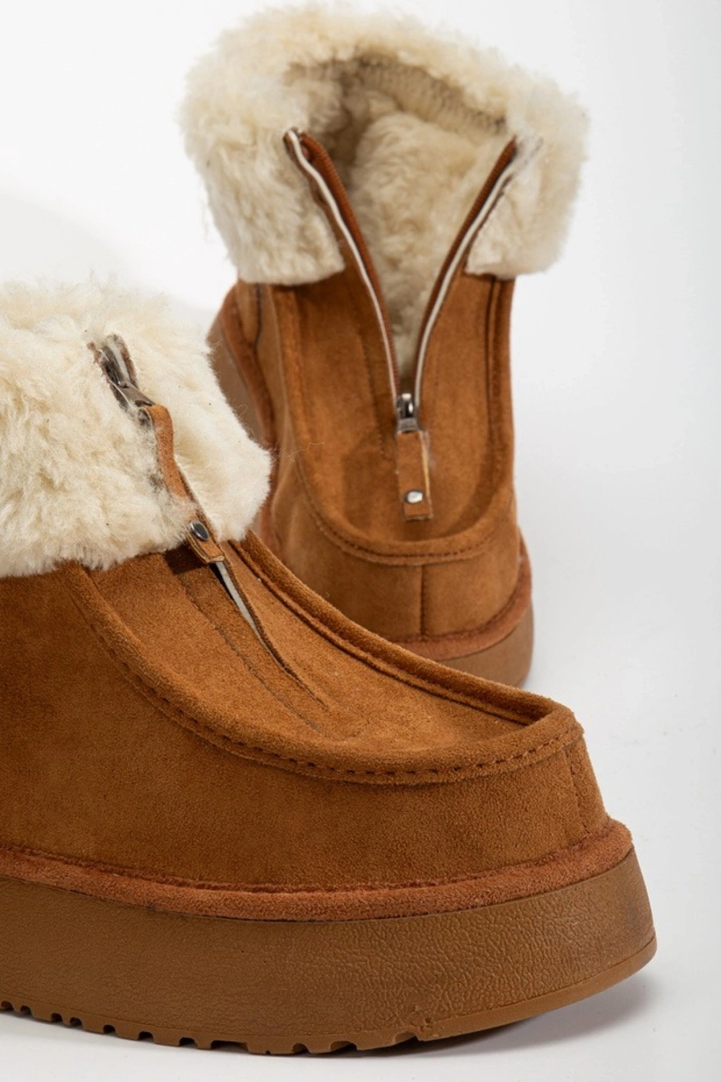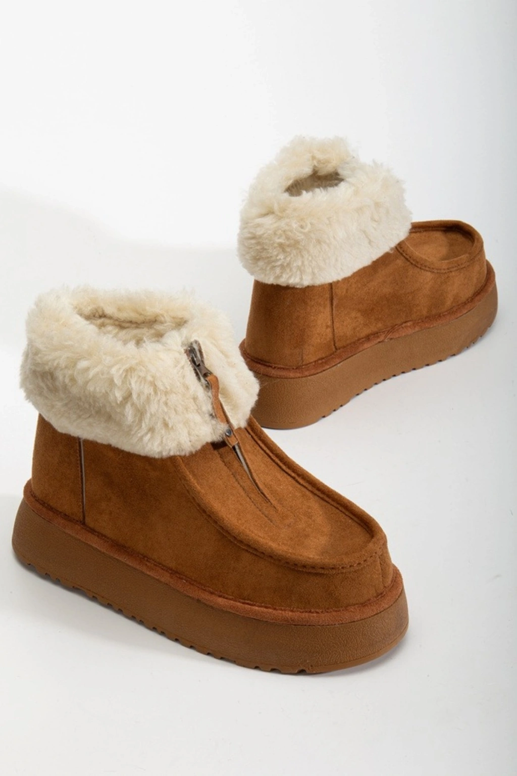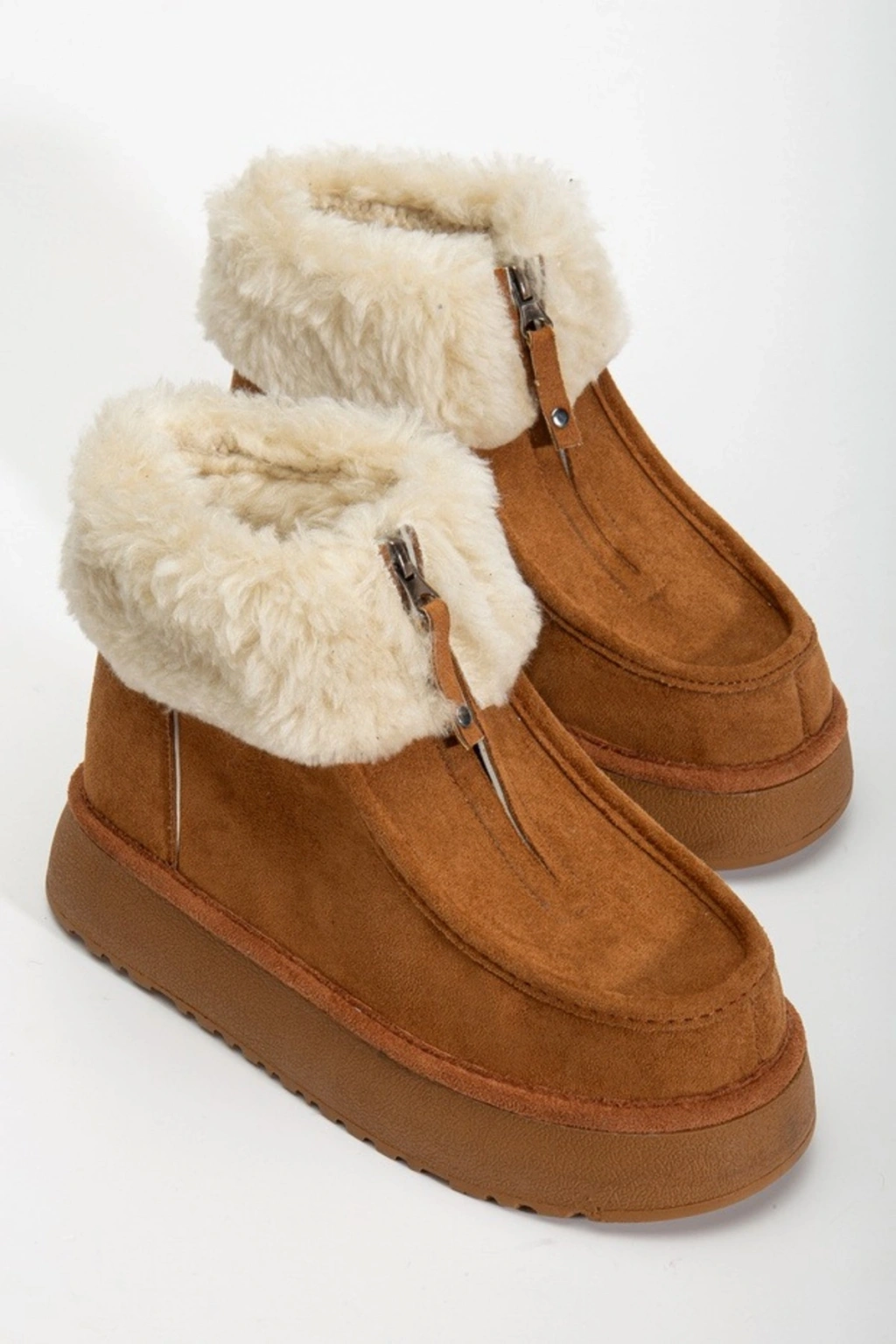 - Yumuşak ve sıcak tutan kürk astarlı iç yapısı ile soğuk kış günlerinde ayaklarınızı korur.; - Kaliteli suni süet deri dış materyali sayesinde dayanıklılık ve şık bir görünüm sunar.; - EVA taban materyali, hafifliği ve konforu bir arada sunarak uzun süreli kullanımlarda bile rahatlık sağlar.; - Fermuarlı bağlama şekli ile kolay giyilip çıkartılabilir; pratik kullanım imkanı sunar.; - Casual/Günlük ortamlarda rahatlıkla tercih edilebilecek tasarım, stilinizi tamamlar.; - Tekstil saya materyali ve astarı, nefes alabilirliği artırarak ayak sağlığınızı destekler.; - Yuvarlak burun tipi ile modern ve zamansız bir görünüm kazandırır.; - Bootie kalıbı, botların klasik ve şık duruşunu ön plana çıkarır.; - Günlük kullanım için idealdir; hem konforlu hem de şık adımlar atmanız için tasarlanmıştır.; - Kalın topuklu tasarım, dengeli bir yürüyüş deneyimi sunarken boyunuzu da hafifçe yükseltir.; - Türkiye'de üretilmiş olup, yerli malı olarak gurur verici bir tercih seçeneği sunar.; - Kısa topuk boyu (4 cm) ile hem rahatlık hem de zarif bir duruş sağlar.; - Yetişkin kadınlar için ideal yaş grubuna hitap ederken düz deseniyle kolayca kombinlenebilirlik sunar.;